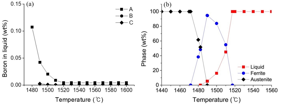 시작하였다. 액상 내 보론 함량은 오스테나이트상이 생성되는 1,490 °C 부근에서 급격히 증가하여, 1,480 °C에서 1,074 ppm으로 초기