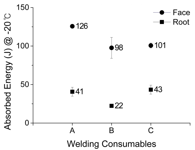 Impact toughness measured at -20 °C for various welding consumables
