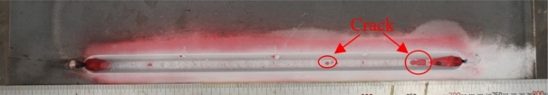 고온균열 평가용 시편은 초층 용접 후 균열 발생 유무를 확인하기 위해서 그림 2와 같이 액체침투탐상검사(Liquid Penetrant Testing)를 실시하여 육안으로 확인되는 균열의 길이와 개수를 측정하였다. 또한, 기계적