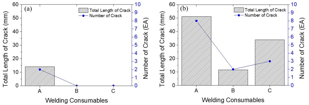 용접재료 B는 가장 양호한 수준의 전체 균열 길이와 균열 개수를 보였고, 보론을 제거하고 망간을 첨가한 용접재료 C는 용접재료 A와 B 중간정도의