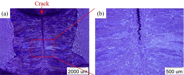 사진이다. 그림 5a와 같이 용융계면에서 성장한 주상정 미세조직이 만나는 최종 응고 지점인 용착금속 중심선에서 깊이 방향으로 균열이 확인되었다. 균열은 용접부 중심선의