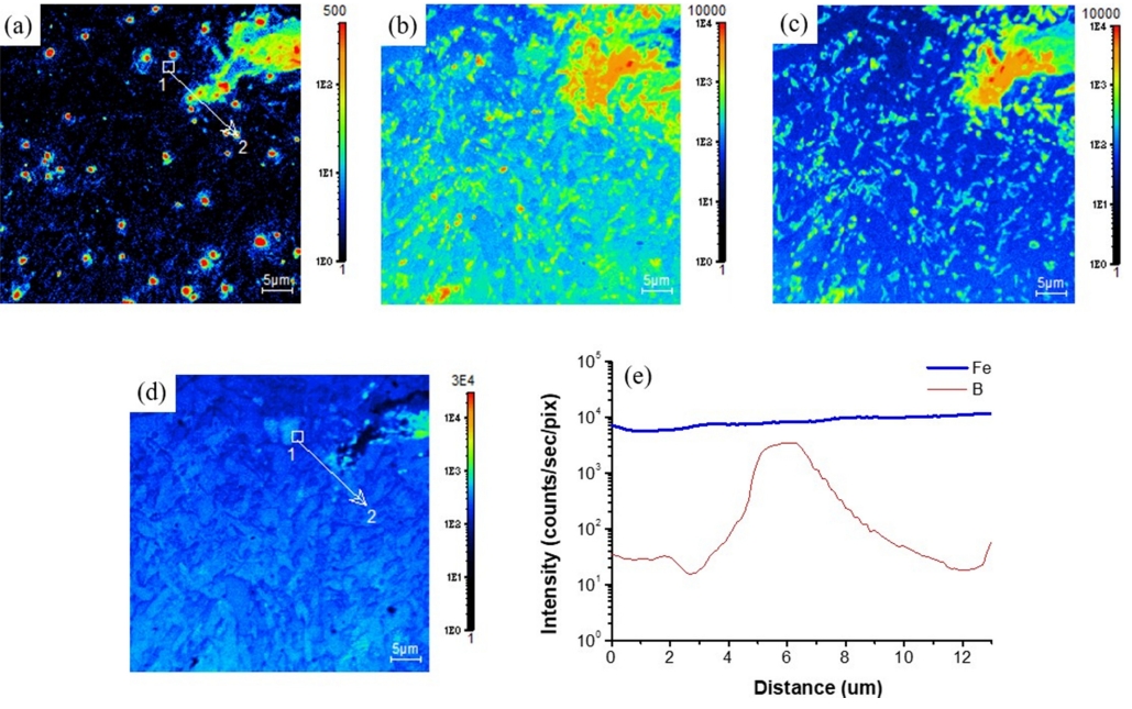 따라서 고온균열 끝단부 및 측면부 미세균열에 집중된 보론(그림 8a 및 그림 9a)은 열역학 계산에 의한 액체 상태에서 보론 편석(그림 11a)으로 설명이 가능하며, 고온에서 냉각하는 과정에 보론은 철과 탄소와 결합하여 상온에서 결정립계에 대표적으로 보론 탄화물의 형태로 존재하는 것은 이미