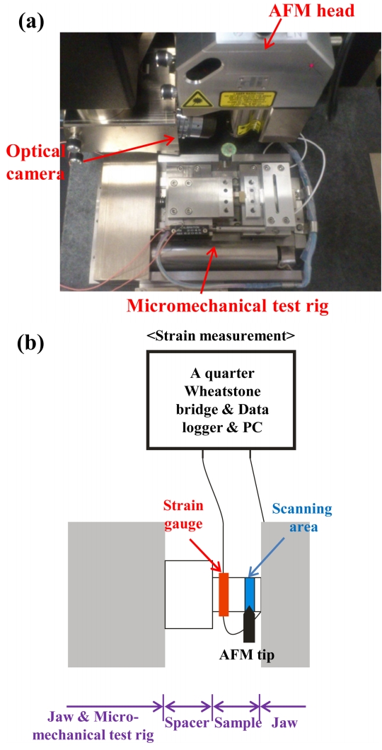 (a) Controlling the location of the micromechanical test rig under the AFM head. (b)