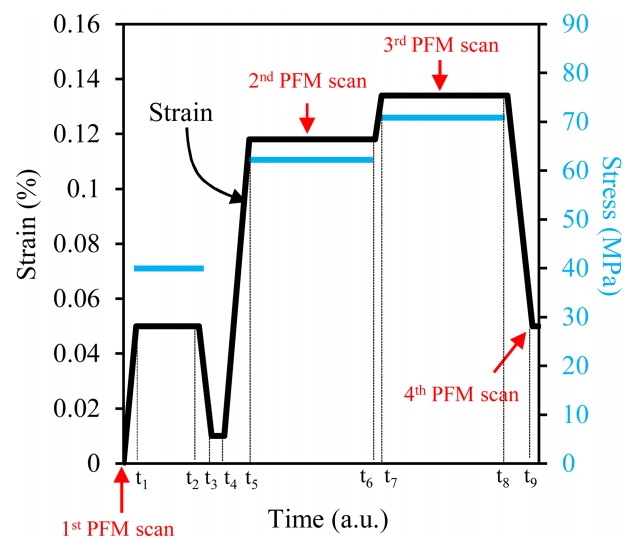 surface where the PFM scan was conducted (Fig 1(a)). The applied stress and measured strain as a function of time are shown in Fig 2. PFM scans were performed four times: before the compression, at 60 MPa, at 70 MPa,