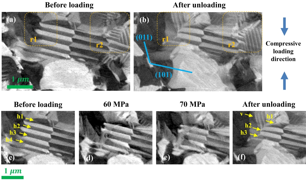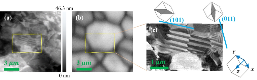 by the rectangle, and the PFM image before compressive loading is shown in Fig 3(c). Using the EBSD data, the crystallographic planes (101) and (011) were distinctively