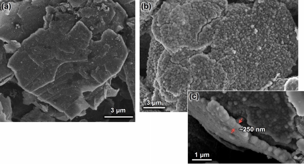 Secondary electron images of graphite particles recorded (a) before and (b) after