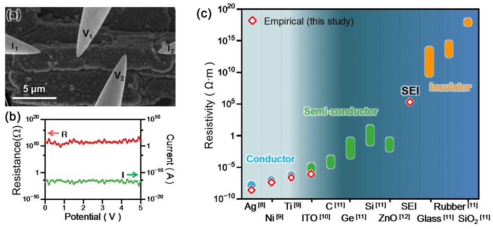 측정한 전류는 전압에 관계없이 매우 낮은 일정한 값(10-14 A)을 나타냈다 (그림 2(b)). 이 결과는 SEI가 계면 저항이 매우 높은 물질임을 시사한다. 측정된 저항값을 ρ = R×(t×w) ⁄L의 관계로부터 환산하여 SEI가 매우 높은 비저항값(ρ = 2.3 × 105 Ω·m)을 가진 계면임을 확인하였다. 본 연구에 사용된 방법의 신뢰성을 검증하기 위하여 비저항값이 알려진 재료(Ag, Ni, Ti, In-Sn-O