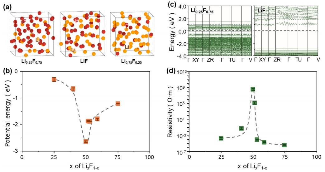 LixF1-x 상이 갖는 비저항을 조성에 따라 계산하고 그 값을 실제 실험값과 비교하였다 (그림 3(d)). 대부분의 상들은 LixF 구조가 도체에 가까운 낮은 비저항을 갖는 반면에, LiF 근처의 구조만이 실험의 측정값에 가까운 높은 비저항(105-109 Ω·m)을 나타낸다. 이는 LiF 비정질상이 비저항이 높은 전자구조를 가지며, 이는 실제 SEI가 LiF의 조성과 전자구조를 가지며, 이 재료가