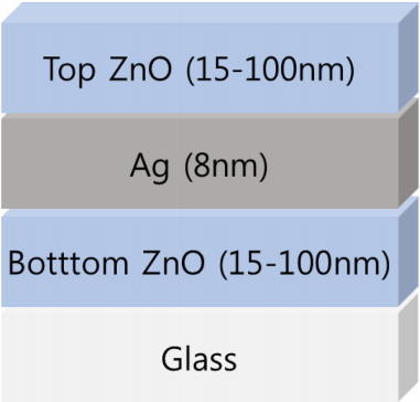 고정한 채 상부 ZnO층은 15-100 nm, 하부 ZnO층은 10-100 nm 범위에서 두께를 변화시키며 ZnO/Ag/ZnO 투명전극을 제조하였다.