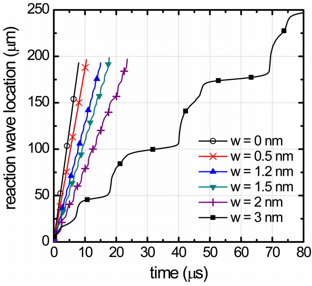 Fig 10, the numerical results of the above case (w = 3 nm) are shown as the time trace of the reaction wave location, along with the