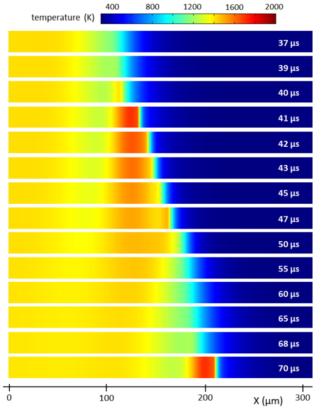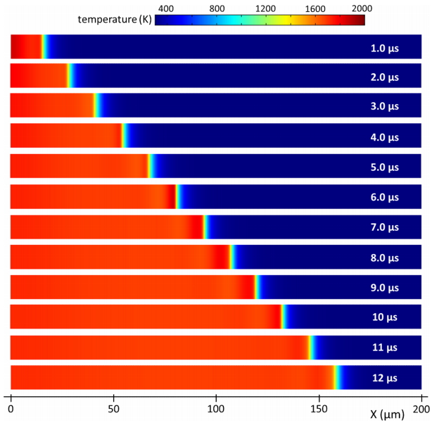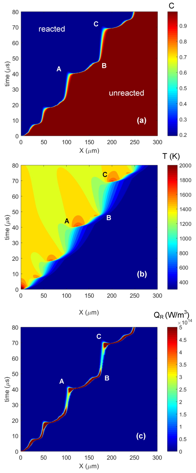 and a subsequent much higher level of heat generation, as shown in Fig 11(c). This leads to the abrupt propulsion or acceleration of reaction wave propagation