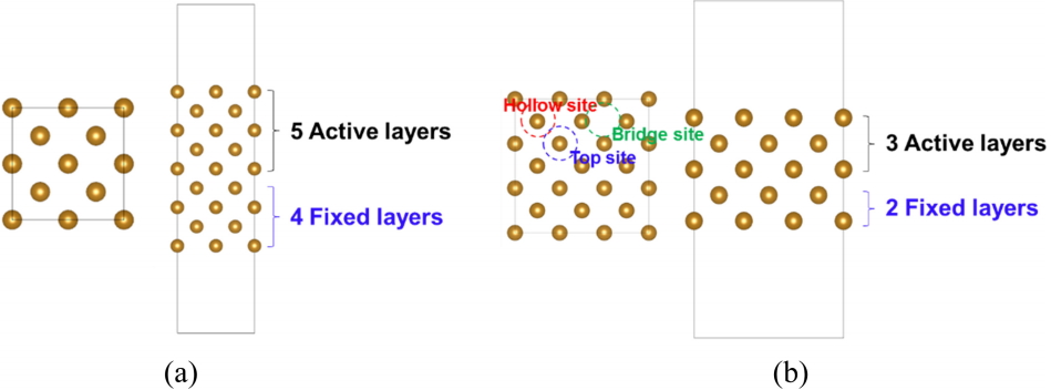 layers)을 갖는 모델을 생성하였는데 하부 4개(3 × 3 × 1: 2개)의 원자층은 원자의 위치를 고정함으로써 벌크 모델의 특성을 유지하였고,