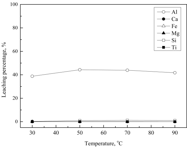 higher than 98% but the leaching percentage of alumina was only around 35% [15]. No Ca, Fe, Mg and Ti oxides were dissolved, except for alumina and silica, at every