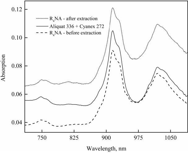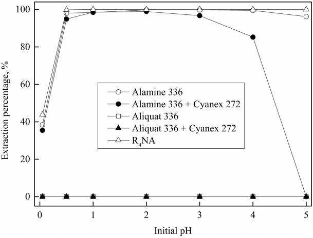 condition: pHinitial = 2.0, [NaCl] = 0.1 M, [R4NA] = 1 M, [Aliquat 336] = [Cyanex 272] = 0.5 M, O:A = 1:1.