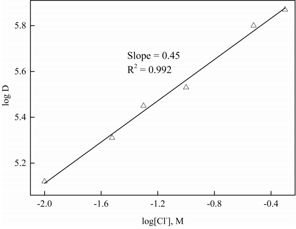 Plot of log D vs log[Cl−]. Experimental condition: pHinitial = 2.0, O:A = 1:1, [R4NA] = 0.1 M.