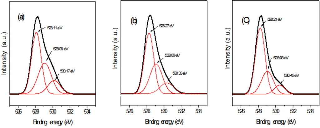 energy peak는 529.08 eV의 값을 가지며, 이는 oxygen-deficient (산소공핍) 영역에 존재하는 산소이온에 의해서 나오는