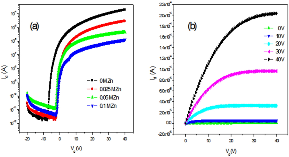 아연의 도핑 효과에서 0.025 M을 도핑한 경우가 가장 좋은 transfer curve와 output curve를 나타내기에 이에 대하여 더 살펴보고자