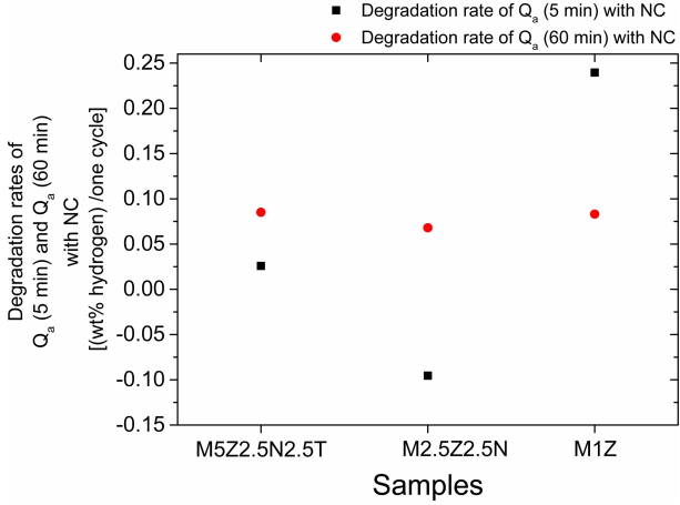Figure 5 shows that the degradation rate of Qa (5 min) with NC (0.240 wt% hydrogen/cycle) of M1Z is much larger than those of the