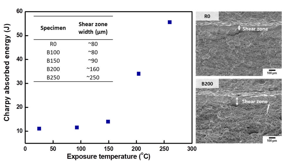zone width 도 노출 온도가 높아짐에 따라 증가하며 샤르피 충격 흡수 에너지와 비례하는 1:1 상관관계를 보인다. 샤르피 충격 시편 파면에서