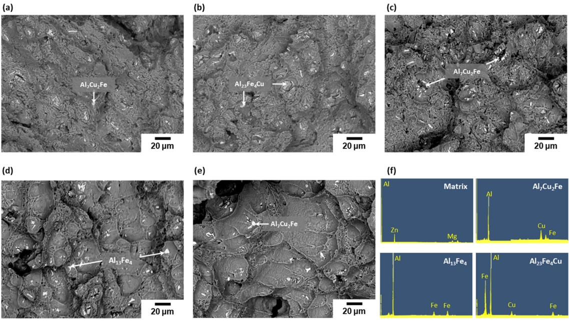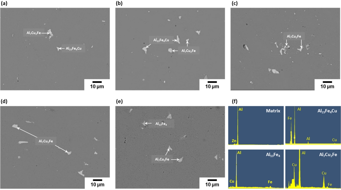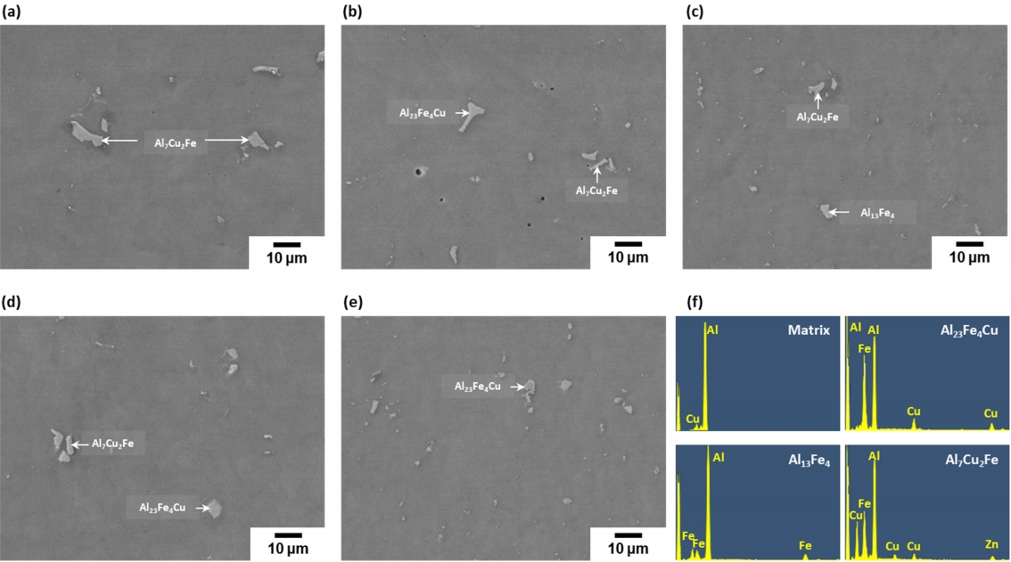 작용할 수 있다고 보고되고 있다 [36]. 본 연구에서 관찰되는 Fe 를 포함한 Al-Cu-Fe 계 이차상들은 크기가 5 μm 이상으로 파괴 개시점으로 작용하며 재료의 인성을 저하시키는