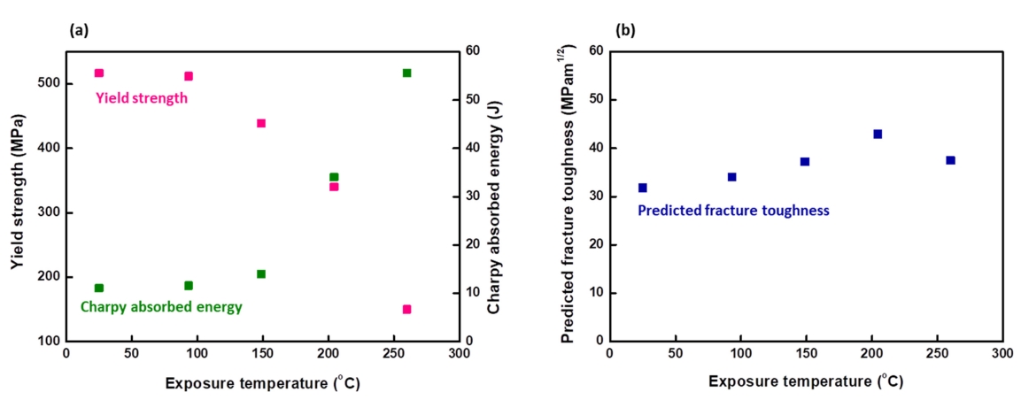 및 샤르피 충격 에너지 값과 기존 문헌의 고온 파괴 인성 값 [37,38]을 바탕으로 하여 α와 β 값을 구하였으며, α는 2.44 × 10-1, β는 -3.44 × 10-2 으로 계산되었다. 이를 통해 도출한 온도에 따른 파괴 인성 값을 그림 13 에 나타내었다. 그림 13(a)에서 볼 수 있듯이 10 시간 고온 노출 환경에서 노출 온도가 증가함에 따라 항복강도는 감소하고 샤르피 충격 흡수 에너지는 증가한다. R0, B100,