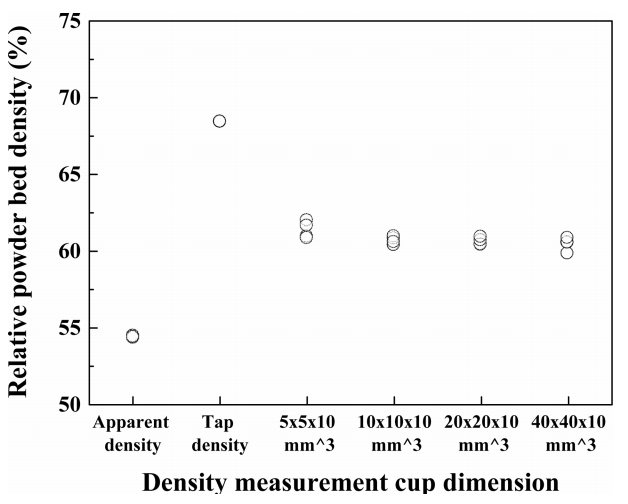 To evaluate the powder bed packing density, density measurement cup tests were conducted