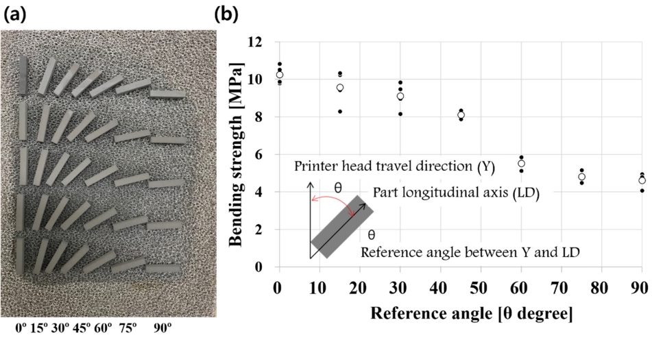 (a) Green body samples and (b) 3-point bending strengths according to reference angles