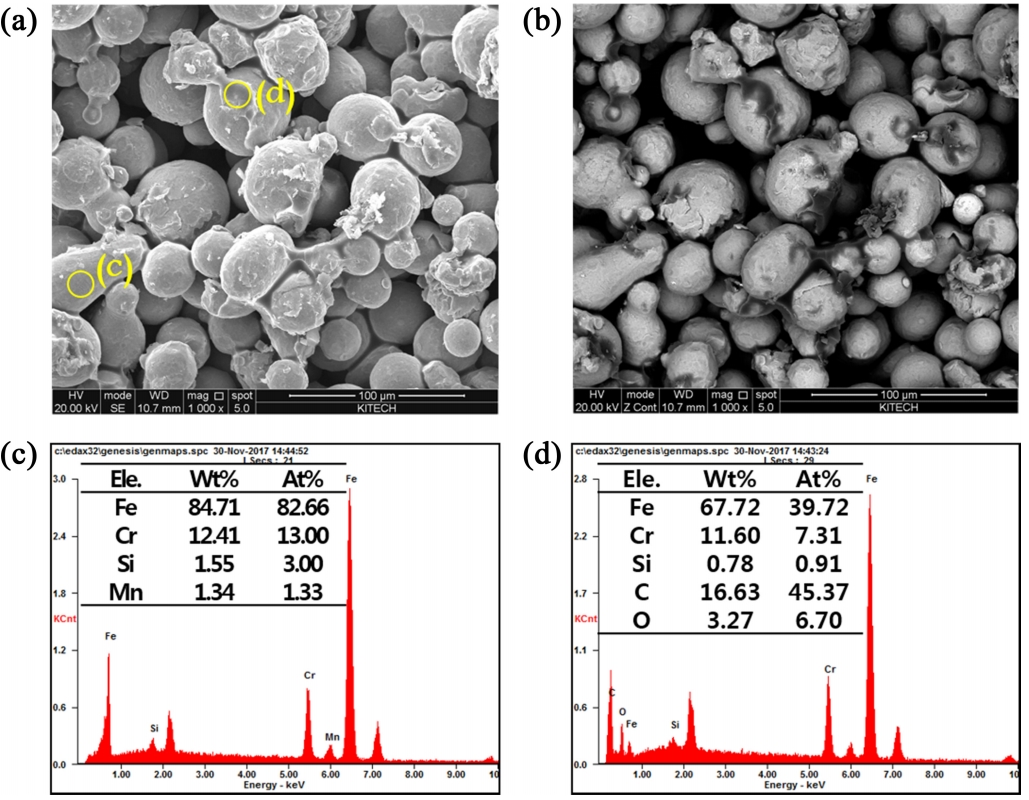 back-scattered electron image, and (c) and (d) are energy dispersion spectra of marked