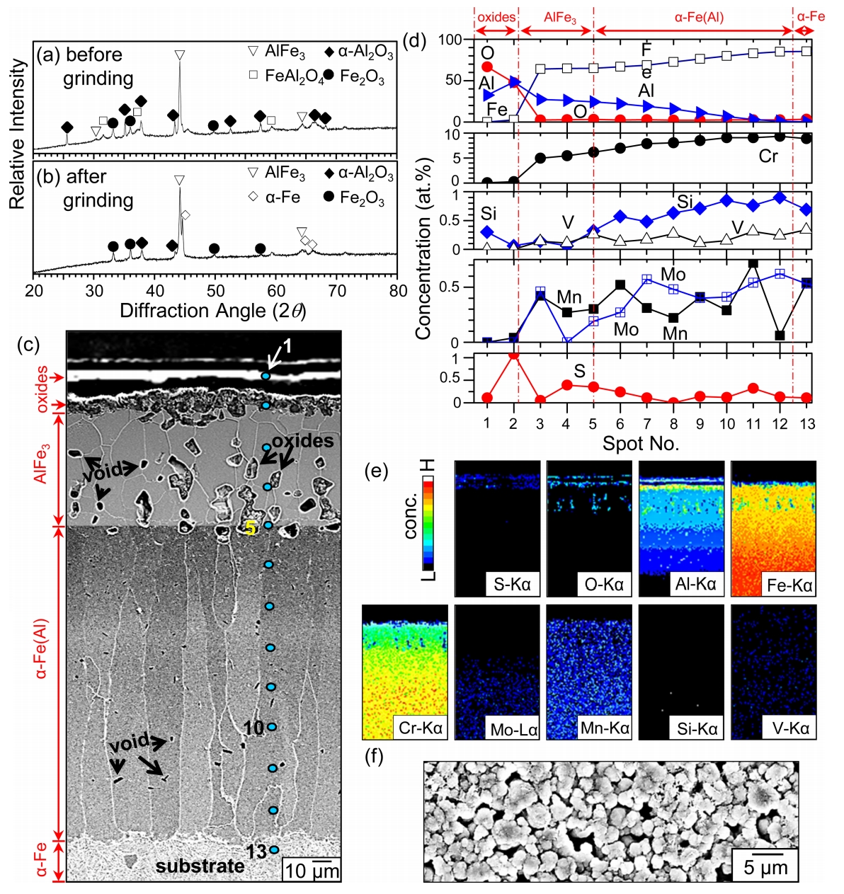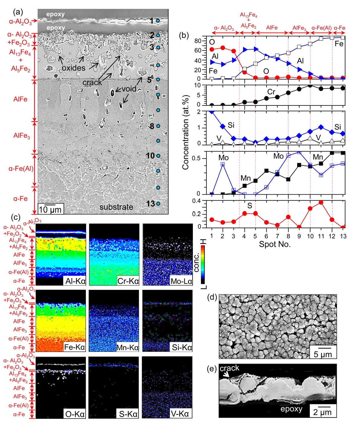 of internal voids as shown in Fig 3(a). The voids appeared smaller down in the coating. Cracks propagated across the (Al13Fe4, Al5Fe2)-mixed layer and AlFe layer (Fig 4). Among Al-Fe intermetallics, Al13Fe4 and Al5Fe2 are brittle, AlFe is ductile, and Al3Fe is the most ductile [25]. The α-Al2O3 surface scale was partially detached, below which the adherent α-Al2O3 layer existed (Fig 4).