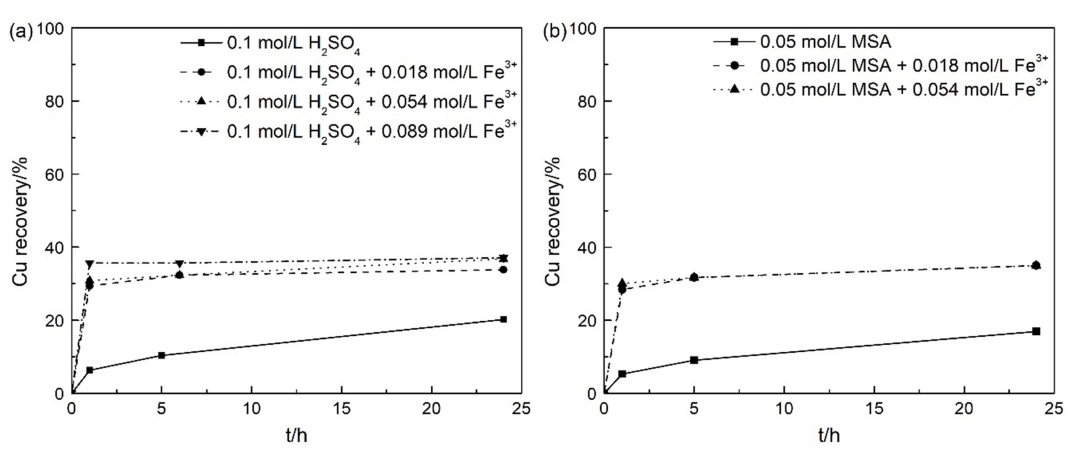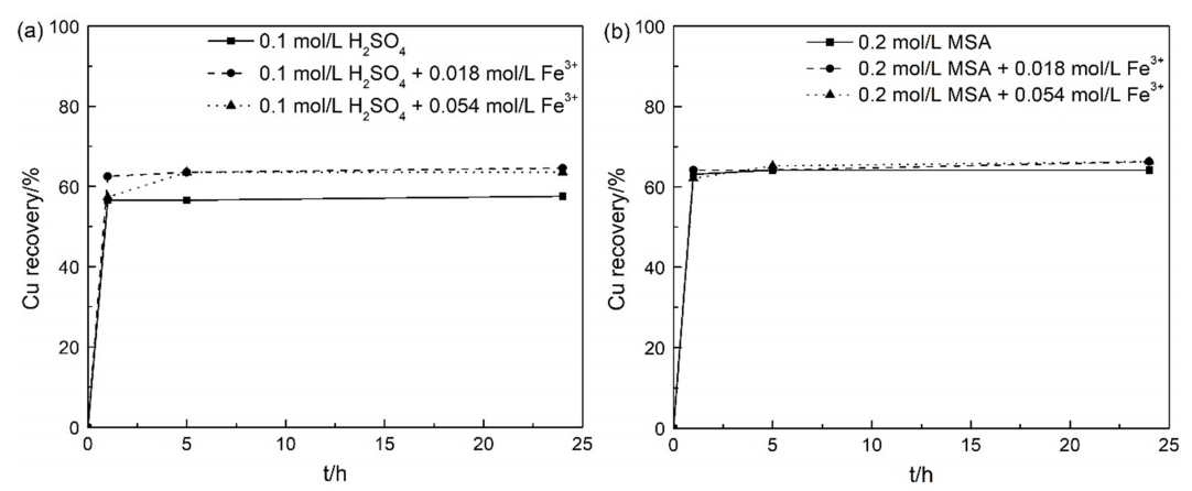 Copper recovery of sample A in sulfuric acid/MSA with ferric ion is shown in Fig 1. The copper dissolution kinetics were relatively fast and reached the maximum value