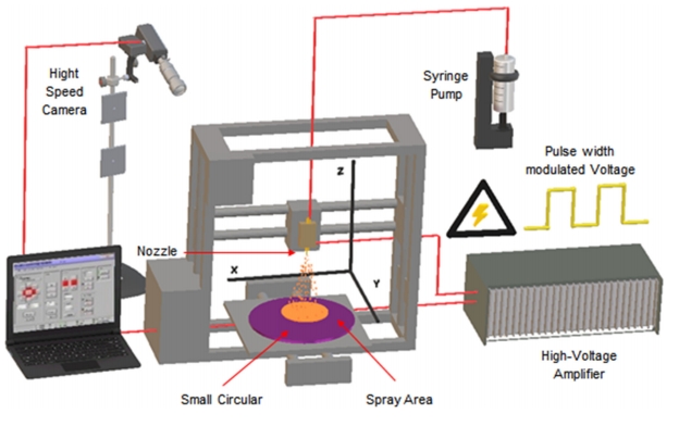 고전압을 인가하여 전위차를 주면 노즐 끝에서 토출(jetting)과 분산(spray)이 일어나게 되고 이러한 과정은 고속 카메라로 관찰이 된다. 기판은