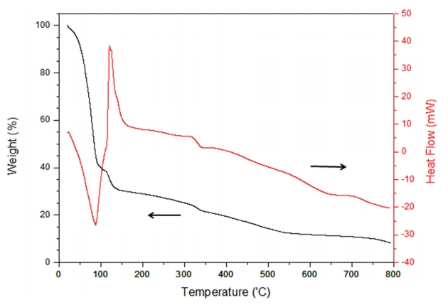 증발에 의하여 나타나는 것으로 TGA에서도 중량의 감소가 같이 일어난다. 이후에는 약 320 ℃ 부근에서 약하게 발열피크 (exthothermic