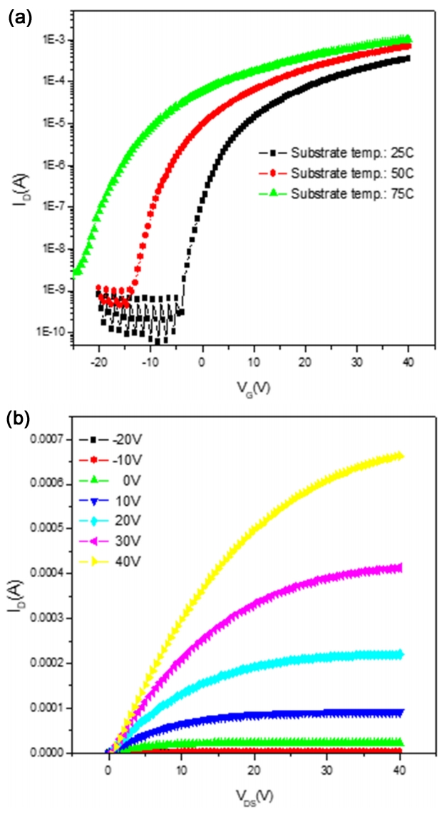 보면 기판의 온도가 50 ℃에서는 이동도는 7.40 cm2/V s, 문턱전압은 -3.2 V, 전류비(on-to-off current ratio)는 6.93 × 104, 그리고 subthreshold slope는 1.2 V/dec이다. Transfer curve에 따른 전기적특성 값에서는 기판의 온도가 25 및
