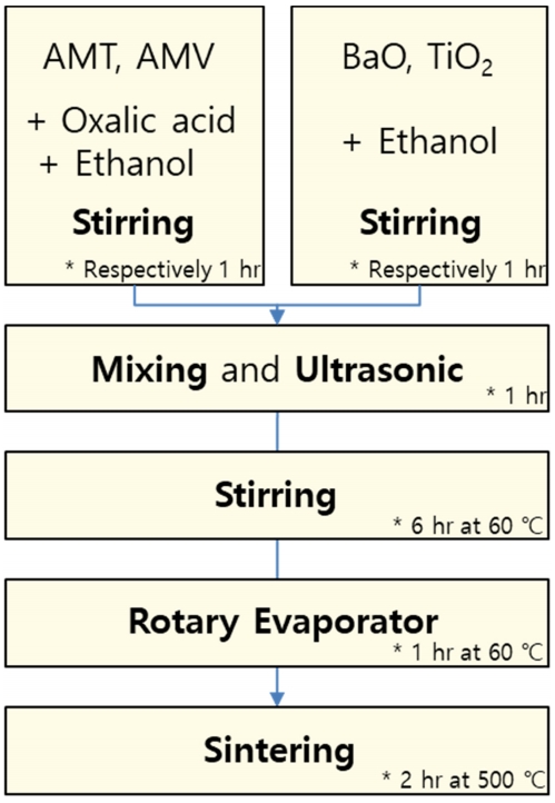 BaO๋ 3~10 wt%๋ก ์ฒจ๊ฐํ์์ผ๋ฉฐ TiO2๋ BaO์ ๋ฐ๋ผ ํจ๋์ ๊ฐ์ํ์๋ค. ์ด๋งค๋ ๊ทธ๋ฆผ 1๊ณผ ๊ฐ์ด ํจ์นจ๋ฒ์ผ๋ก ํฉ์ฑ๋์๋ค. AMT์ AMV๋ ๊ฐ๊ฐ์ ๋น์ปค์ ์ฅ์ด์ฐ์ด ์ฉํด๋ ์ํ์ฌ ์ฉ์ก์ 60 โ์ ์จ๋์์ 1์๊ฐ ๊ต๋ฐ์ ์ค์ํ์๊ณ , TiO2์ BaO๋ ์ํ์ฌ ์ฉ๋งค๋ฅผ ์ฌ์ฉํด 1์๊ฐ ๊ต๋ฐํ์๋ค. ์ํ์ฌ์ ์ถฉ๋ถํ ์ฉํด๋ AMV, AMT ๋ฐ BaO ์ฉ์ก์ TiO2๊ฐ ๋ถ์ฐ๋ ์ํ์ฌ ์ฉ์ก์ ํผํฉํ์์ผ๋ฉฐ, ์ด๋ค ์ฉ์ก์ ์ด์ํ ๋ถ์ฐ ๊ณต์ 1์๊ฐ ์ค์ํ์๋ค. ํผํฉ๋ ์ฉ์ก์ 60 โ์์ 6์๊ฐ ๊ต๋ฐ ํ์์ผ๋ฉฐ, ๊ต๋ฐ ์