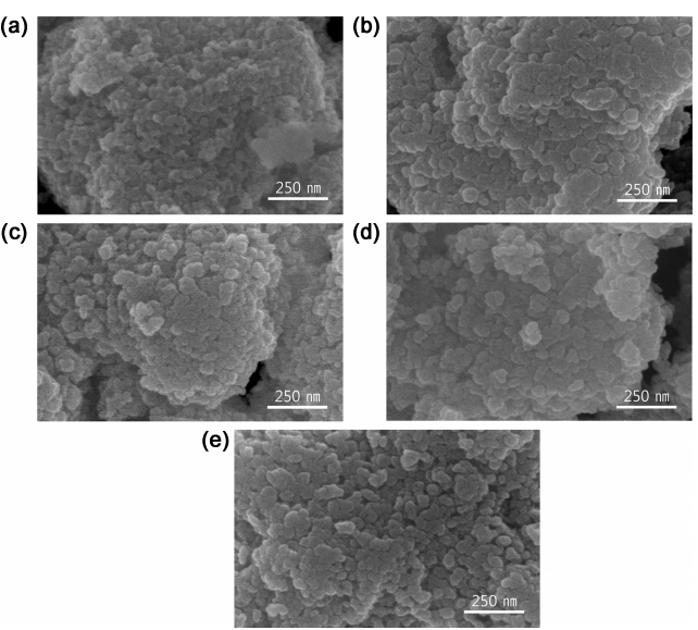 SEM images of the BaO loaded V2O5-WO3/TiO2 catalyst. ((a) VWTi, (b) BaO(3)/VWTi, (c) BaO(5)/VWTi, (d) BaO(7)/ VWTi, (e) BaO(10)/VWTi)