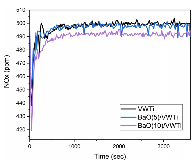 Adsorption behaviors of the BaO loaded V2O5-WO3/TiO2 Catalyst at gas condition with [NO]=500 ppm, [O2]=5 vol%, [N2]=balance and GHSV=30,000 h-1