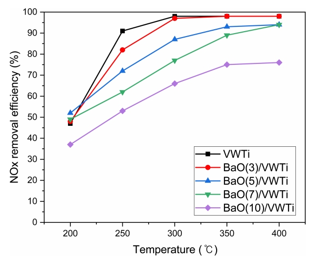 NOx removal efficiency of the BaO loaded V2O5-WO3/TiO2 Catalyst at gas condition with [NO]=300 ppm, [NH3]=300 ppm, [O2]=5 vol%, [N2]=balance and GHSV=30,000 h-1