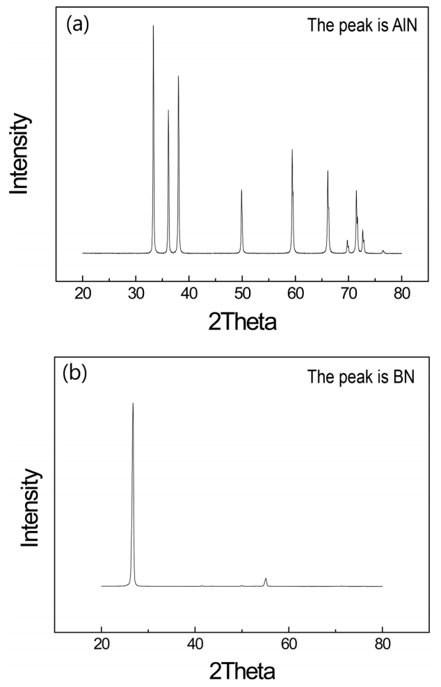 본 연구에서 사용한 AlN은 미국 Alfa 회사에서 구입하였고, 분말의 크기는 4 μm 이하이며 순도는 99.5%이었다. BN은 일본 Denka (grade