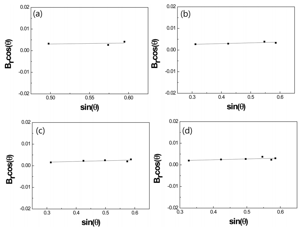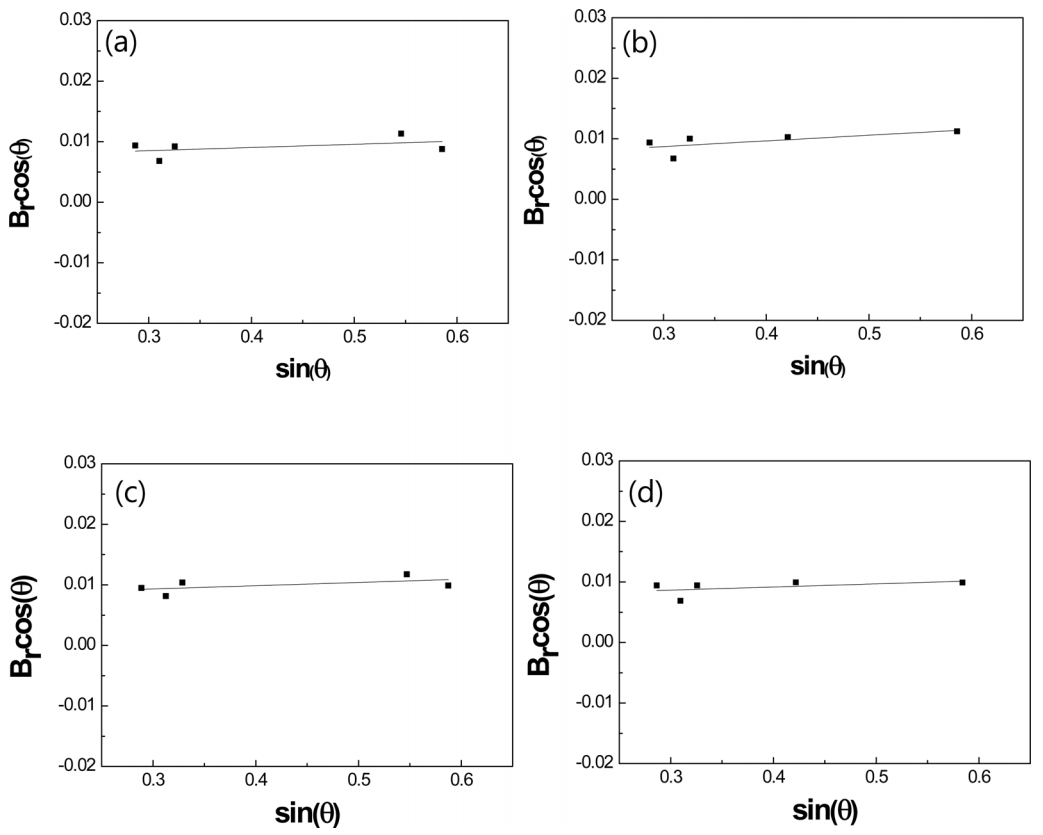 시편에서, AlN 결정립 크기를 Suryanarayana 식 [16]으로 평가하기 위해서 Sinθ에 따른 Br Cosθ 값을 도시한 것은 그림 6에 나타내었다. 절편의 값으로부터 계산한 AlN, AlN-1 vol% BN, AlN-3 vol% BN, AlN-10 vol% BN에서 AlN 결정립