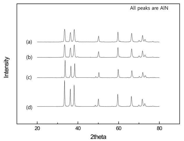 시간이 작아서 AlN 결정립 성장이 어렵기 때문으로 판단된다. 또한, 고 에너지 볼 밀링한 AlN 나노분말을 초기 분말로 사용했기 때문으로 생각된다.
