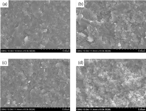 1455, 1147, 1110 kg/mm2이고 4, 5.7, 5.5, 5.4 MPa·m1/2 이었다. AlN의 경도와 파괴인성은 BN 첨가로 동시에 증가하였다. 이 이유는 첫 번째로 BN 첨가에 의한 AlN 결정립 크기의 미세화와 두 번째로