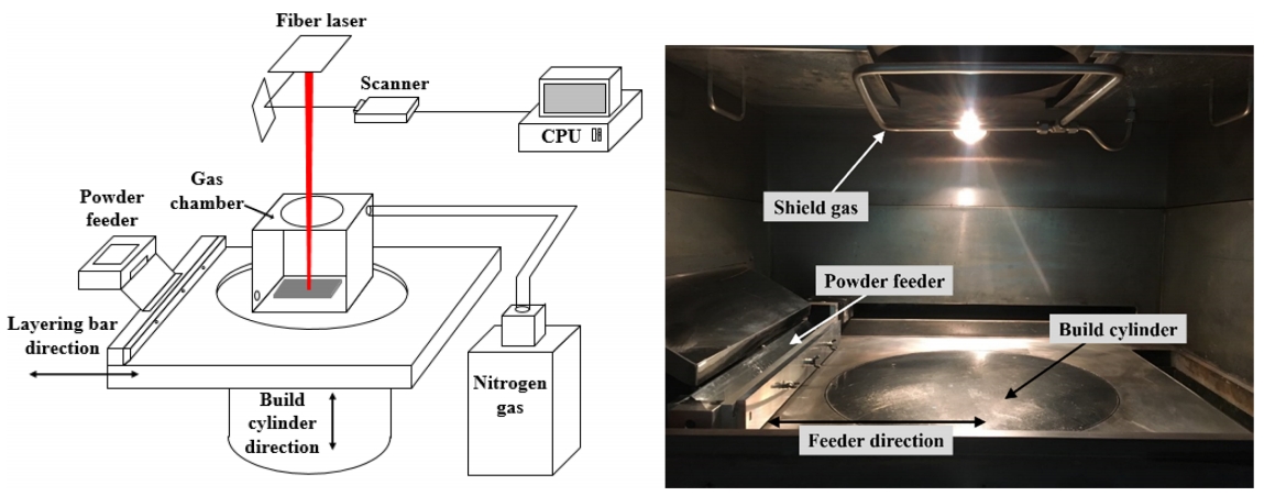 빔 직경 80 μm, 파장 1070 nm의 사양을 가지고 있다. 레이저의 집속 및 이송을 제어하는 스캐너(scanner)는 SCANLAB사의 hurrySCANTM을 사용하였다. DLM 공정시 산화 방지를 위해 N2 및 Ar 분위기 조성이 가능한 챔버(chamber)를 설치하였으며, 레이저, 스캐너 및 다른 모든 요소시스템은 산업용 PC를 통해 제어된다.