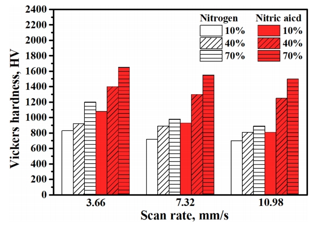 레이저 에너지 입열량이 증가하게 되고, 높은 농도의 질산과 반응하여 용융부에서 질화물의 형성이 활발하게 진행되어 경도값이 증가하게 된다. 또한 질산