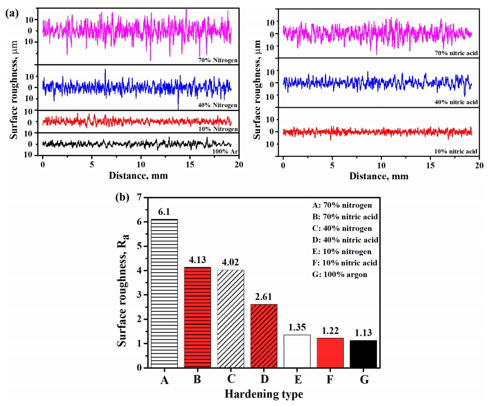여러 공정변수에서 얻어진 표면경화부의 표면 거칠기를 분석하기 위해 그림 12에 경화층의 표면 평균 거칠기 값(Ra)을 나타내었다. 동일한 공정 조건에서 질소를 이용한 공정보다 질산을 이용한 공정에서의 표면 조도가 상대적으로