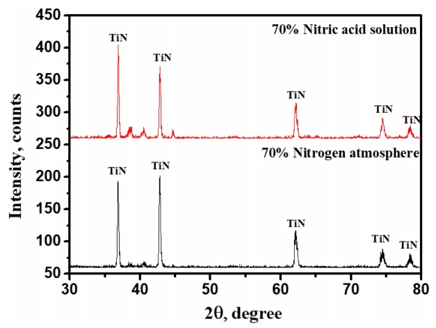 때 용질 한계에 의해 결정된 최대값까지 TiN 상분율이 증가하게 된다 [18-20]. 동일한 70% 농도의 질소와 질산 용액을 비교해 볼 때 질산용액에서의 상분율이 6%정도 높게 분포하며, 이러한 상분율 차이로 인해 질산 용액