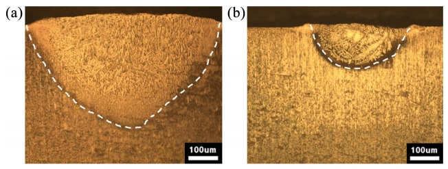 그림 6은 서로 다른 분위기에서 단일 선형상 실험에 따른 비드 (bead)의 단면 형상을 비교하였다. 그림 6 (a)는 70% 질산용액 분위기에서의 단면 형상을, 그림 6 (b)는 70% 질소 가스 분위기에서 얻어진 단면 형상이다. 200 W의 레이저 출력, 3.66 mm/s의 주사속도로 실험을 진행하였을 때, 질산 분위기에서의
