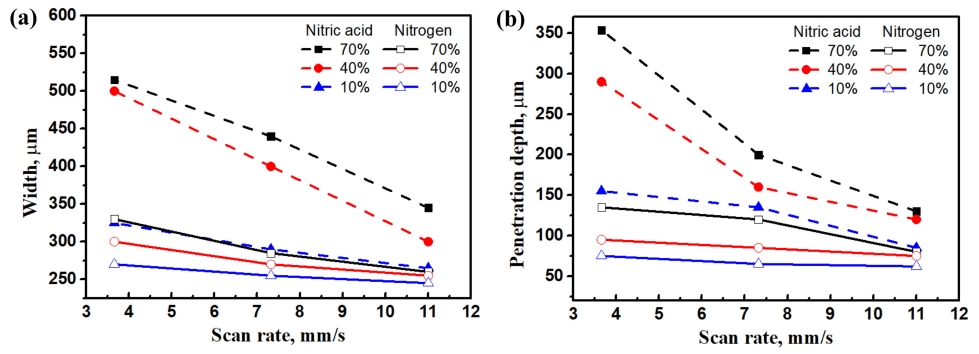그림 8은 다양한 분위기에서 주사 속도의 차이에 따른 질화폭 및 침투 깊이에 대해 비교하였다. 레이저 출력은 200W로 고정하였으며, 낮은 레이저 주사 속도에서
