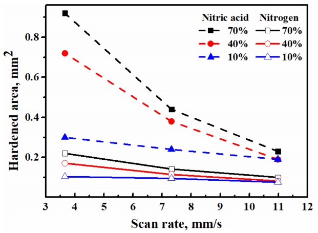 그림 9는 위와 동일한 레이저 출력과 다양한 주사속도(v)에서 질화 영역의 넓이 분포를 나타내었다. 그림에 나타낸 바와 같이 질화 영역은 질산 및 질소의 농도 증가 또는 주사속도의 감소에 따라 증가한다.