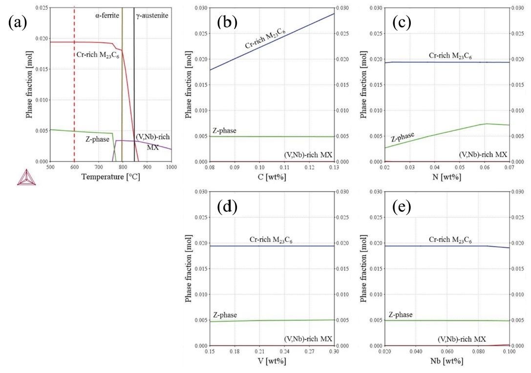 M23C6์ (V, Nb)-rich MX ์๊ณ , ์์ถ๋ฌผ์ ์๋ถ์จ์ Cr-rich M23C6๊ฐ (V, Nb)-rich MX ๋ณด๋ค ๋ง์๋ค (๊ทธ๋ฆผ 1a). ํนํ ๊ทธ๋ฆผ 1b์ฒ๋ผ C ํจ๋์ด ์ฆ๊ฐํ๋ฉด Cr-rich M23C6์ ์๋ถ์จ์ ํฌ๊ฒ ์ฆ๊ฐํ์๊ณ , ๋ค๋ฅธ ์์ถ์ ๋ค์ ๊ฑฐ์ ๋ณํ๊ฐ ์์๋ค [16,17]. ์๋ฎฌ๋ ์ด์