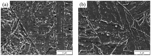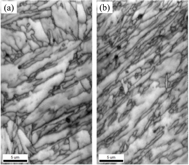 Image quality (IQ) map of EBSD: (a) 0.09C and (b) 0.10C specimens.